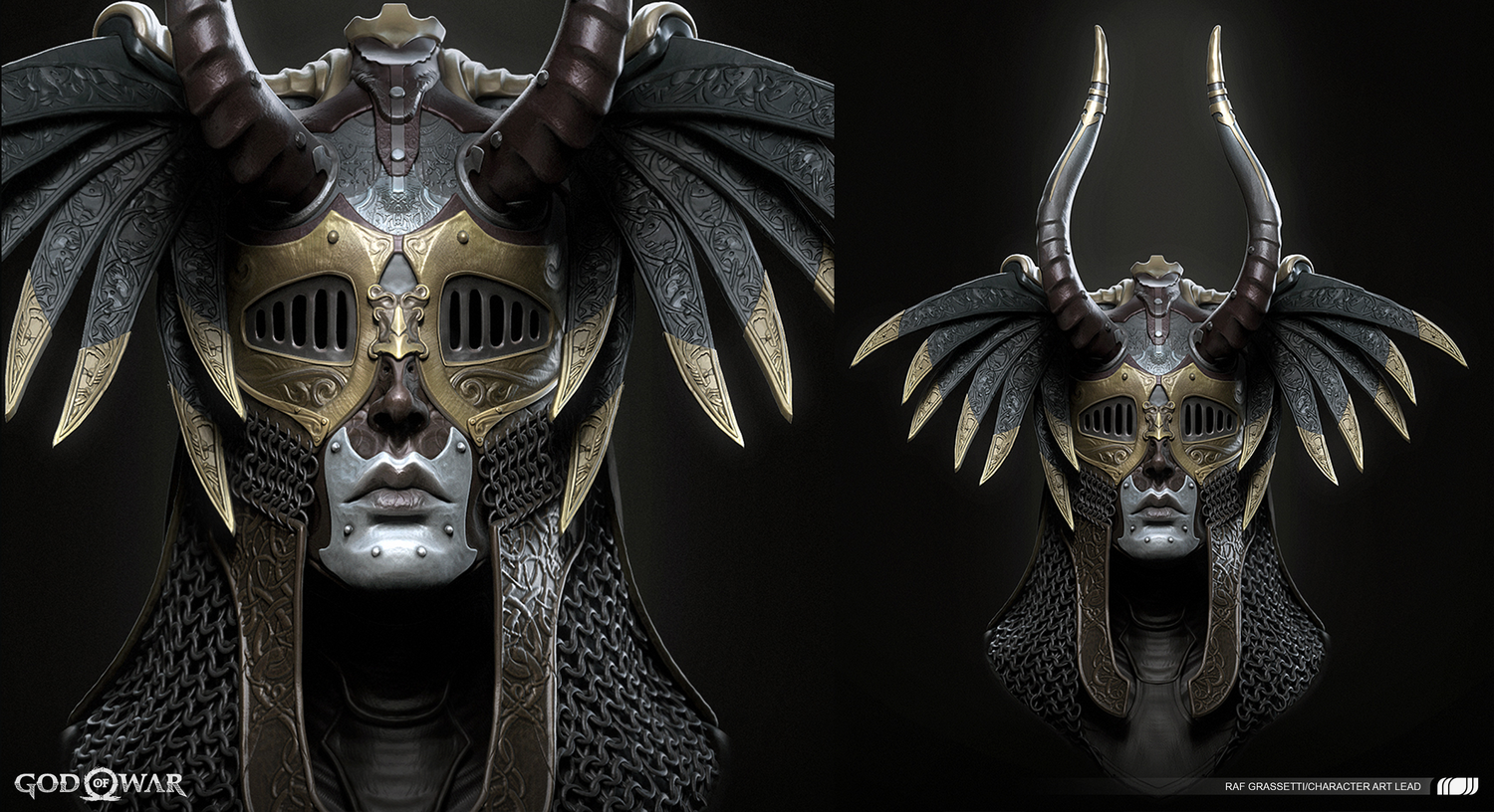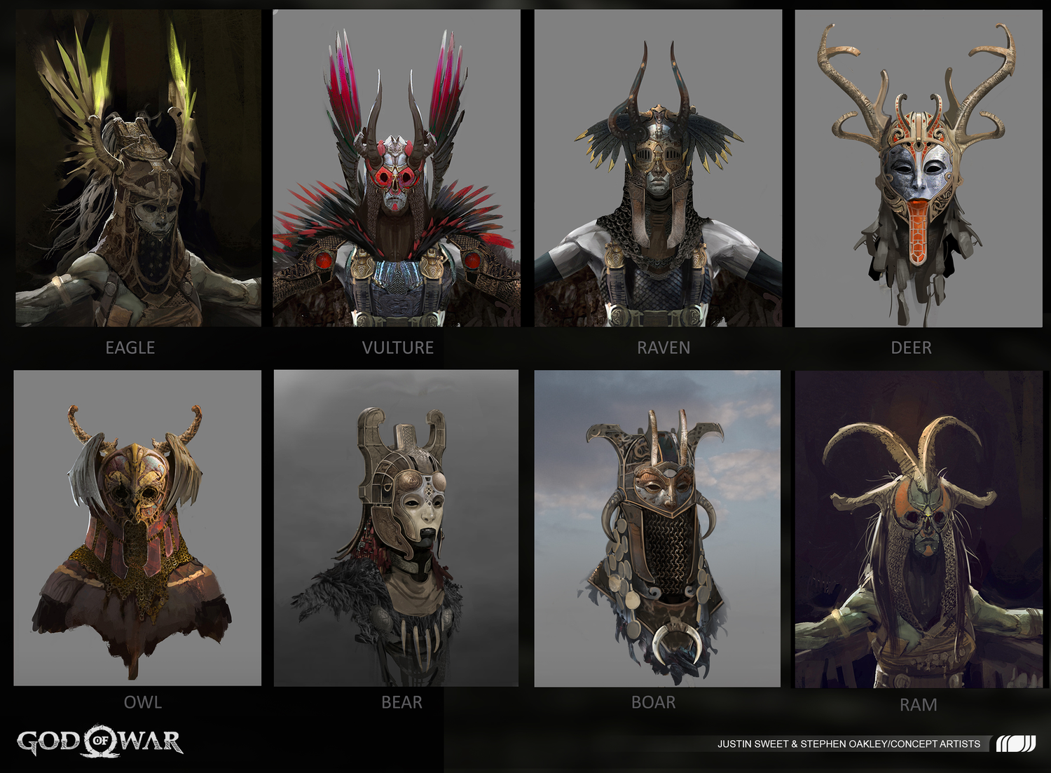 Another distinguished part of the Valkyrie is in their helmet design. Each one would wear a very different type of helmet, yet would be themed together based upon a different creature. There is a constant theme of merging a scary, yet beautiful creation that continued to stay top of mind for the team during the design process. Dela stated, “Initially, we wanted nine variations with the Valkyries and wanted to make it something unique to each of them, so we based them on animals and things we see from nature. The eight Valkyries are all animals designed early on by Vance Kovacs and Justin Sweet.” These masks would extenuate in all different directions, from various color choices to metalwork designs and are an important part of reaching the final Valkyrie, the Queen Sigrun.
